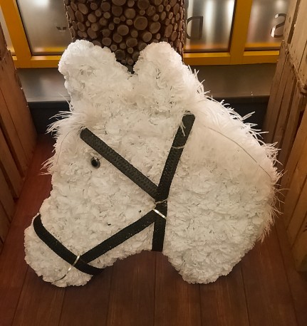 A beautiful floral horses head made of white silk flowers. this can also be made in fresh flowers please state if you would like itin silk or fresh flowers when placing your order.
